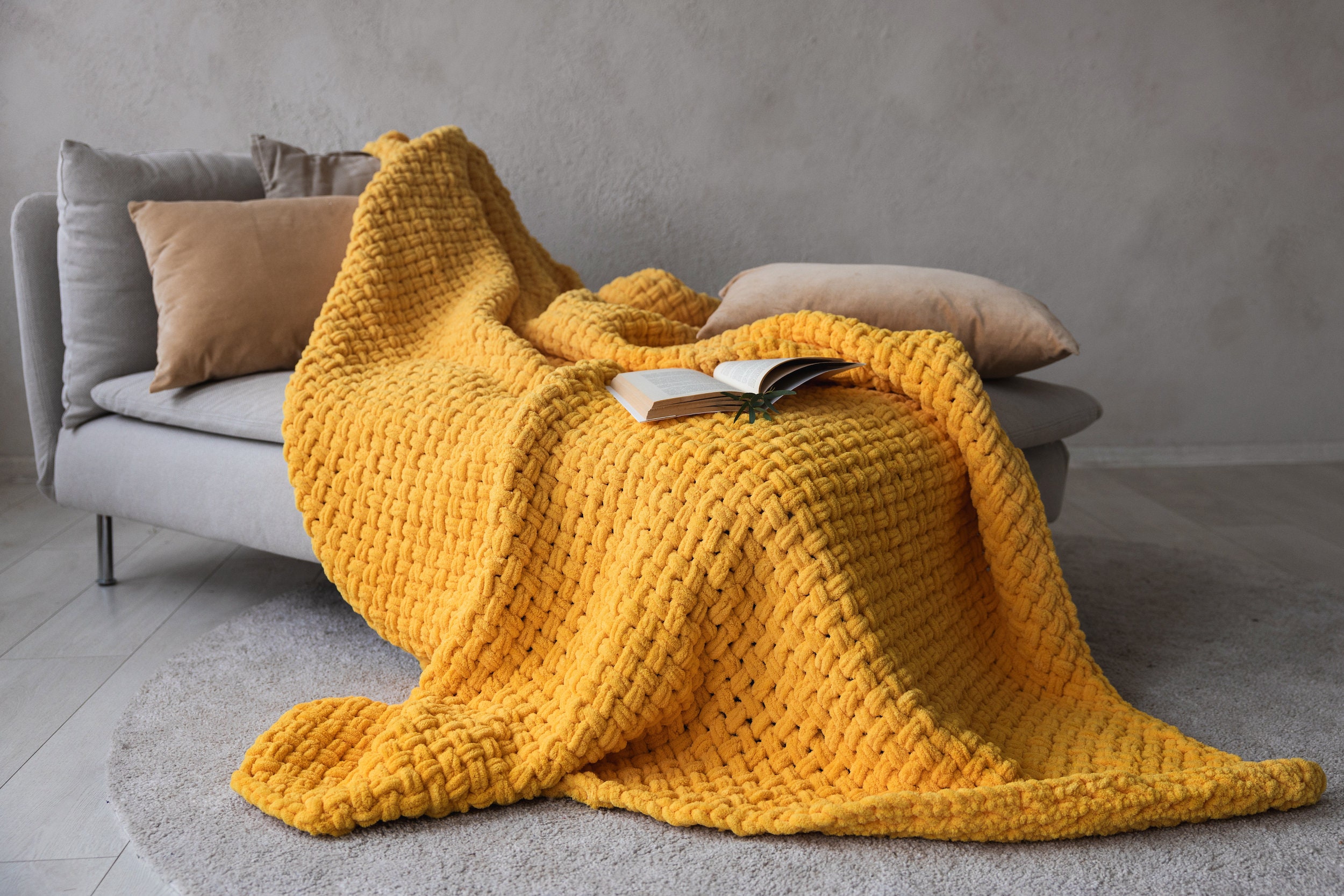 Chunky Knit Yellow Blanket Cozy Micro-Polyester Plaid Throw
