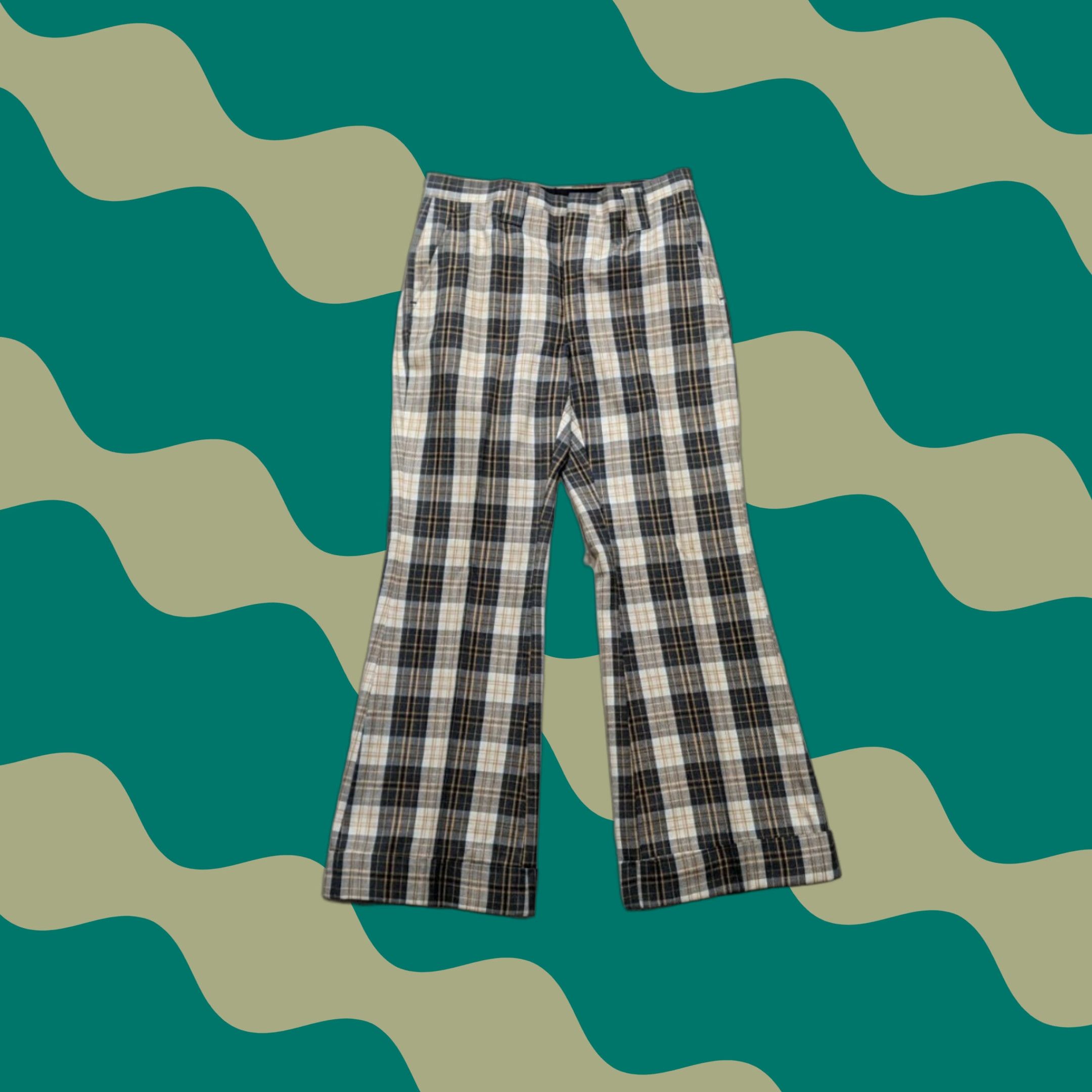 Vintage 70S High Waisted Polyester Plaid Trousers; Wide Leg Pants; Kick Flair Pants With Grid Print & Belt Loops M